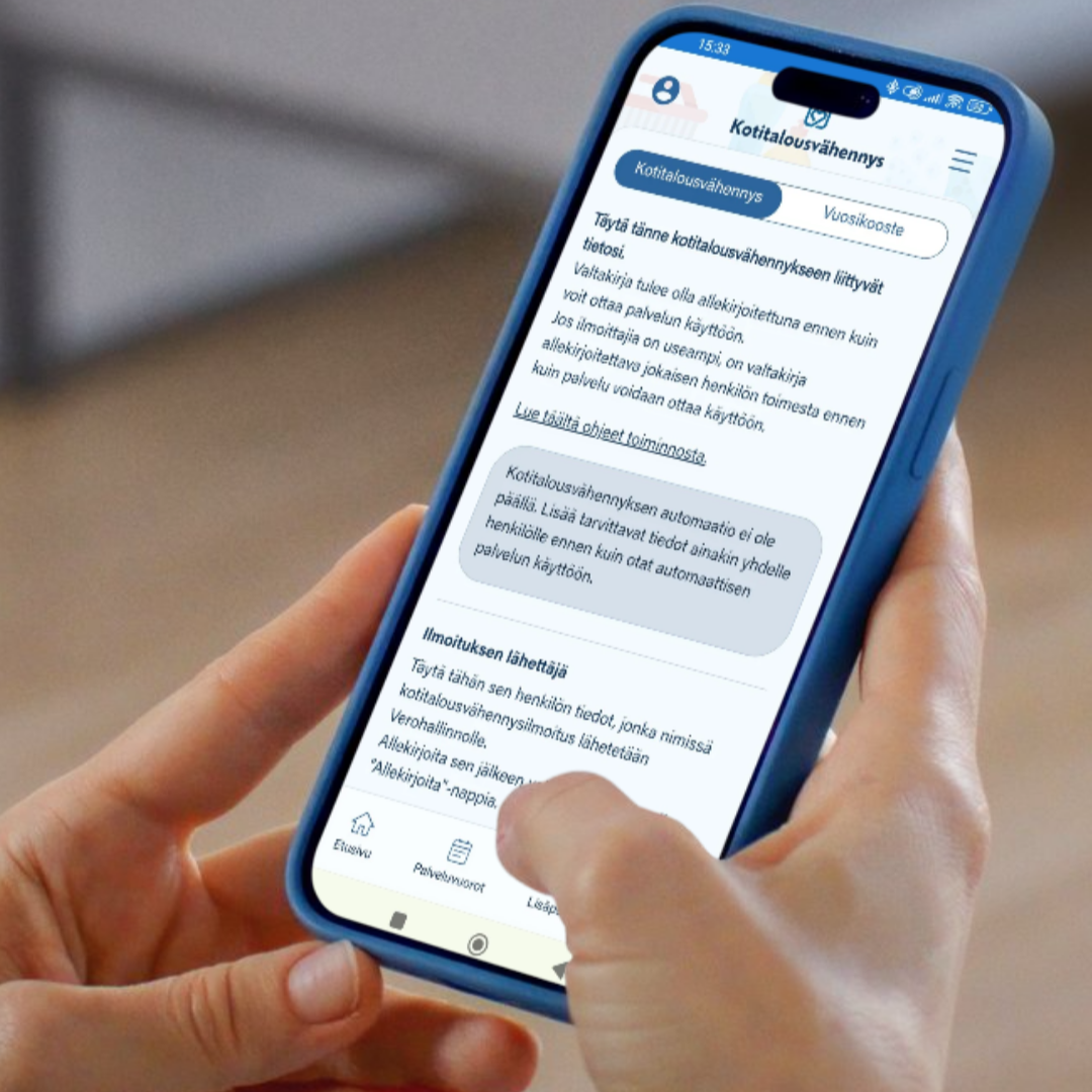 Mikäli vastasit kyllä, voit olla oikeutettu, kotitalousvähennyksen lisäksi, ostamaan palveluitamme (esim. siivouspalvelu, kaupassakäynti, ulkoilu, yhdessä tekeminen) arvonlisäverottomasti.